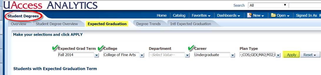 Once the student submits the application for graduation, they will receive an email with instructions to contact you to complete their Degree Audit Worksheet. But you may choose to reach out to them as well. There is a report in Analytics you will use to see who has applied for graduation and therefore needs a Degree Audit Worksheet. Navigate to the Student Degrees dashboard > Expected Graduation tab, and use the top report on that page. Input the Expected Grad Term you want to see (it will default to the current term), your college, and the Undergraduate career, and click "Apply." You can export the results and sort by major.