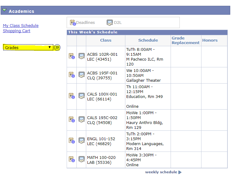 Midterm grades (Early Progress Grading) for first time FR can be seen by advisors and students via the UAccess Student Center (screenshots below). Refer to main page of UAccess Student Center – scroll down bar, select “Grades” – select tab “Early Progress Grading”. Courses that with mid-term grades include: MATH112, CALS195C, CALS100X, ENGL101,102, 107, MIS111 and other success courses from SBS, LASC (CLAS and SCI), BNAD(Eller) numbered 195 or 197 and 100X.
