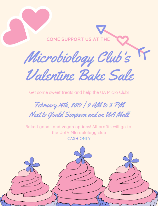 The Microbiology Club will be having a bake sale tomorrow (2/14) from 9 am to 3 pm! Two locations: UA Mall and by Gould Simpson. There will be brownies, cookies, Vegan wedding cookies, Hershey kisses, pumpkin rolls, rice krispies and popcorn. Stop by and grab something sweet for you or someone else!