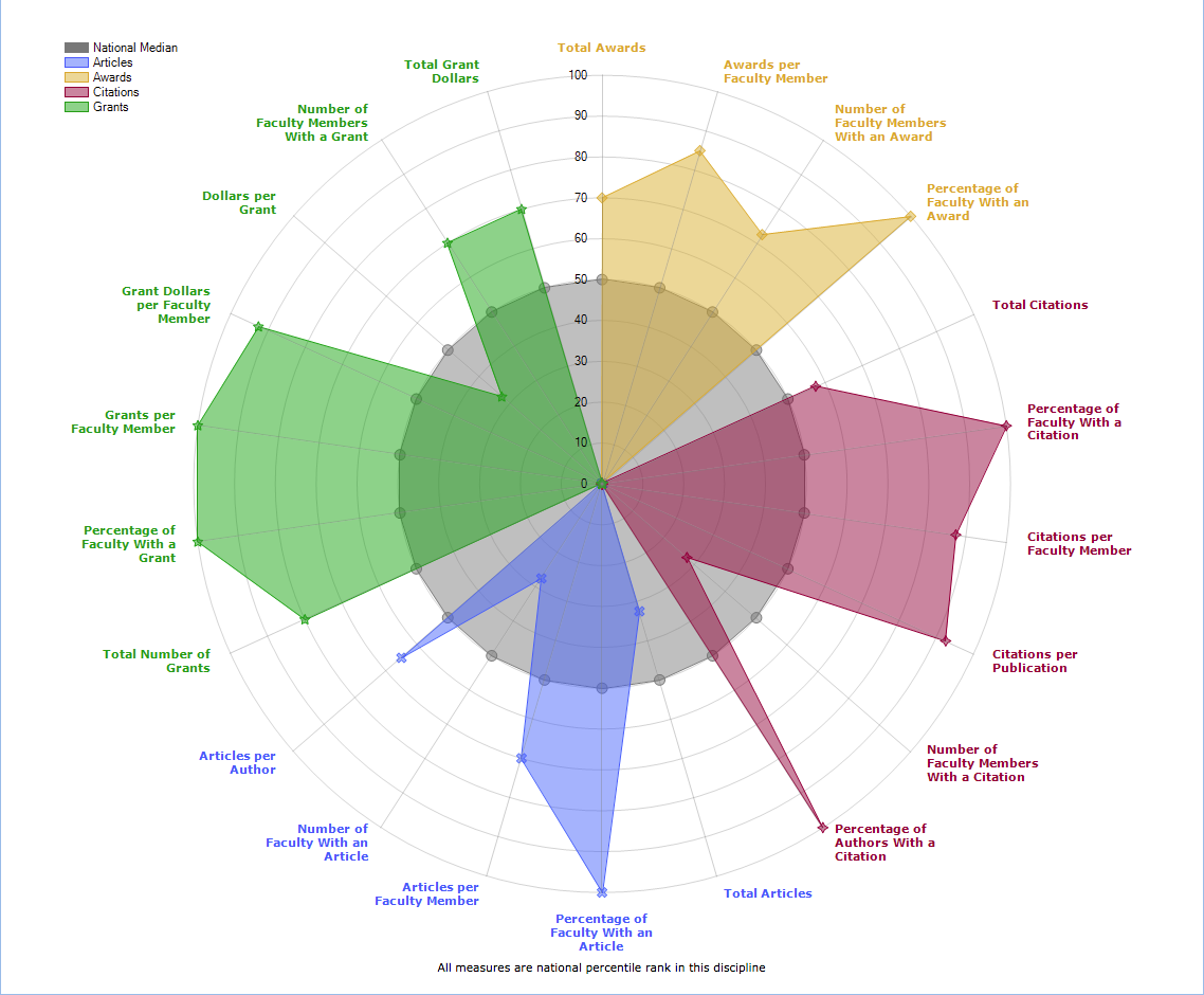 We rank #1 in percentage of faculty with a grant, article, and citation (all three are 100%) as well as grants per faculty member and percentage of faculty with an award (see attached diagram). We rank in the top 4 in citations per publication and grant dollars per faculty member.