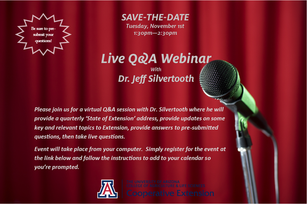 Click here<https://attendee.gotowebinar.com/register/2015913166309528321> to register and add the event to your calendar. Then, pre-submit your questions by clicking here<https://uarizona.co1.qualtrics.com/SE/?SID=SV_3CNYB51xwzTOtJr>.