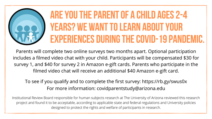 We are looking for parents of young children to participate in an online research study to understand how the Coronavirus pandemic is impacting families. Please share widely with your networks. To see if you're eligible, visit https://rb.gy/swus0x. For more information, contact covidparentstudy at arizona.edu<mailto:covidparentstudy at arizona.edu>.