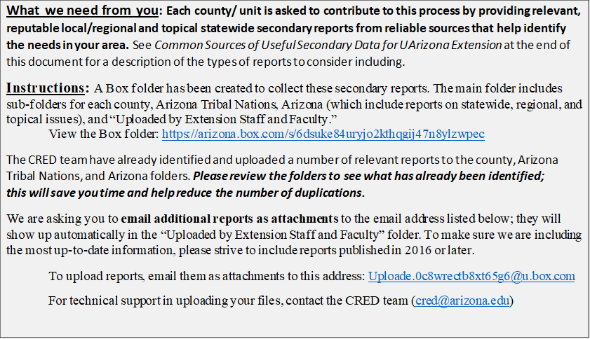 Recently we completed an assessment of the Economic Impact of Cooperative Extension in Arizona. The study performed by TEConomy shows the economic impacts Extension has on the economy statewide and in every county. The final report will be released shortly and completes Phase 1 of our Strategic Planning Initiative. Phase 2 of the initiative is a statewide needs assessment. The needs assessment is being led by Dr. Michele Walsh and her CRED (Community Research, Evaluation & Development) team. This phase of our initiative will require the help and input of everyone in Extension across the state. Below are instructions on our first request – we need information on what data are already available, and we need a list of key stakeholders we should talk with to help inform our statewide needs.