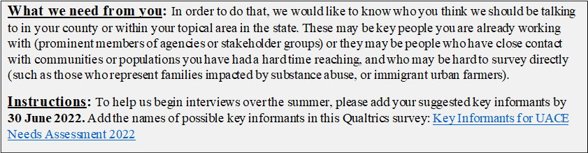 [What we need from you: In order to do that, we would like to know who you think we should be talking to in your county or within your topical area in the state. These may be key people you are already working with (prominent members of agencies or stakeholder groups) or they may be people who have close contact with communities or populations you have had a hard time reaching, and who may be hard to survey directly (such as those who represent families impacted by substance abuse, or immigrant urban farmers). Instructions: To help us begin interviews over the summer, please add your suggested key informants by 30 June 2022. Add the names of possible key informants in this Qualtrics survey: Key Informants for UACE Needs Assessment 2022]<https://uarizona.co1.qualtrics.com/jfe/form/SV_cGzt2urCaUtqrhs>