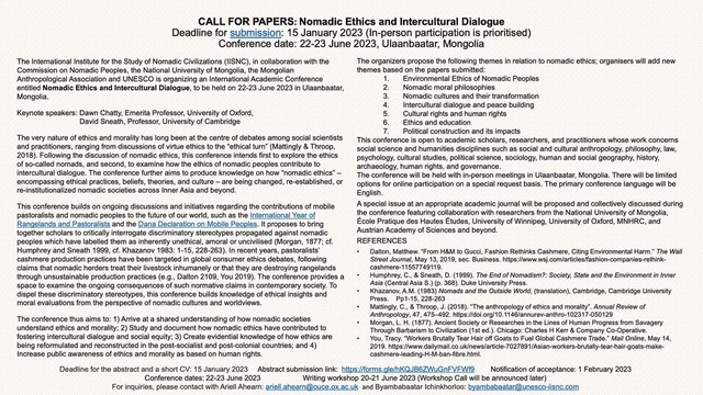 >> Here is a good excuse to plan a trip to Mongolia in June 2023 - a conference on nomads. A person might be able to consider it a business trip for tax purposes. Late June is a good time to see Mongolian rangelands. I plan to go and spend time traveling around Mongolia either before or after the conference. Abstracts are due by January 10, 2023. Please forward this to others that might be interested.