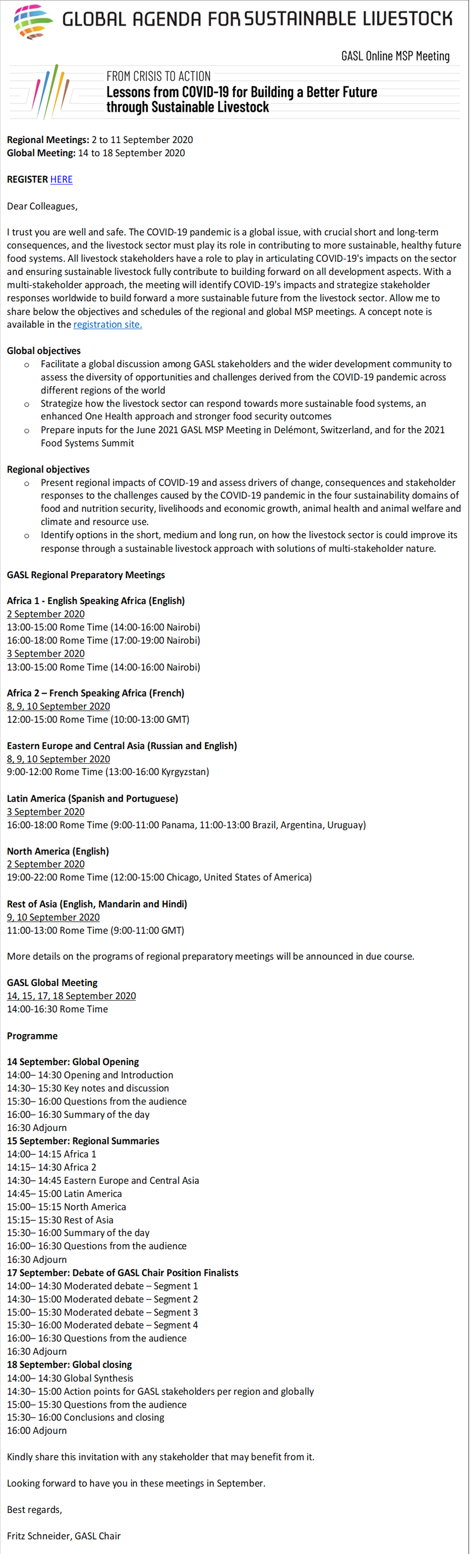 This is a kind reminder for you to register in the GASL Online MSP Meetings<http://www.livestockdialogue.org/events/events/multi-stakeholder-meetings/msp-online-14-18-september-2020/en/> on COVID-19 and Livestock by 18 August 2020. Please read below the schedule details for the different regional meetings and the global meeting.