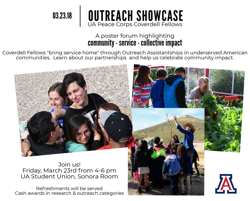 The UA Peace Corps Coverdell Fellows invite you to attend our Outreach Showcase on Friday March 23 from 4-6 p.m. We’ll have a display of posters reflecting outreach and research that Fellows carried out this year and a reception. To register to attend, please fill out the form at this link by Monday, March 19: https://goo.gl/forms/RZyi15VcmP6ZlVys2 . We hope to see you!