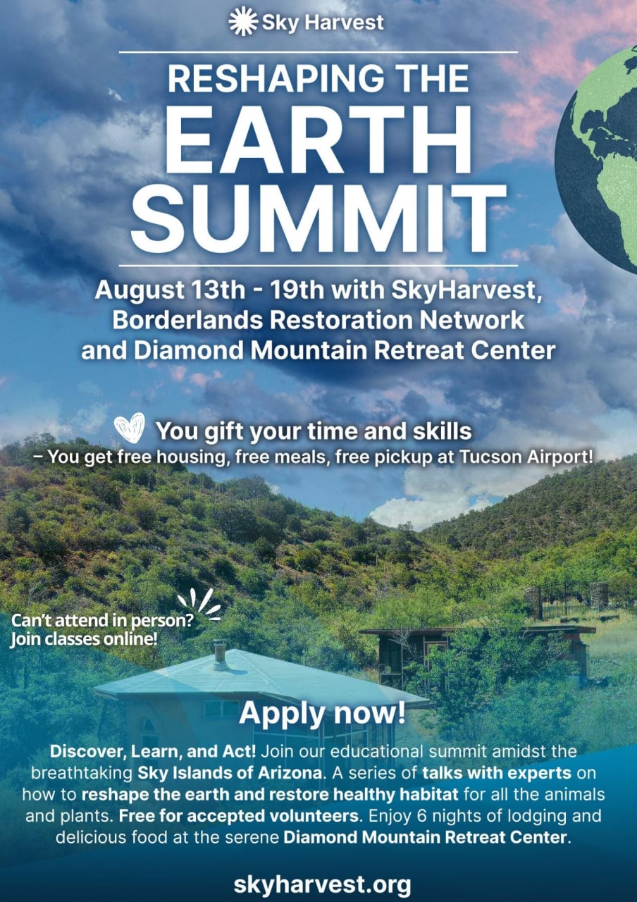 Attend the educational summit classes in person and then volunteer implementing what the experts shared in the forum, working in the field alongside experts making loose rock dams and eradicating invasive plant species. The Sky Islands in Southern Arizona are the most biodiverse area in the United States! Come learn about this amazing ecosystem and how to restore arid lands. Ten ecological restoration experts will give 45 minute lectures during the week long event on subjects such as water retention techniques, soil regeneration, green corridors and food forests. Includes 6 nights lodging and food at Diamond Mountain Retreat Center. Free event for accepted volunteers (donations to SkyHarvest encouraged!) Apply to attend online at SkyHarvest.org