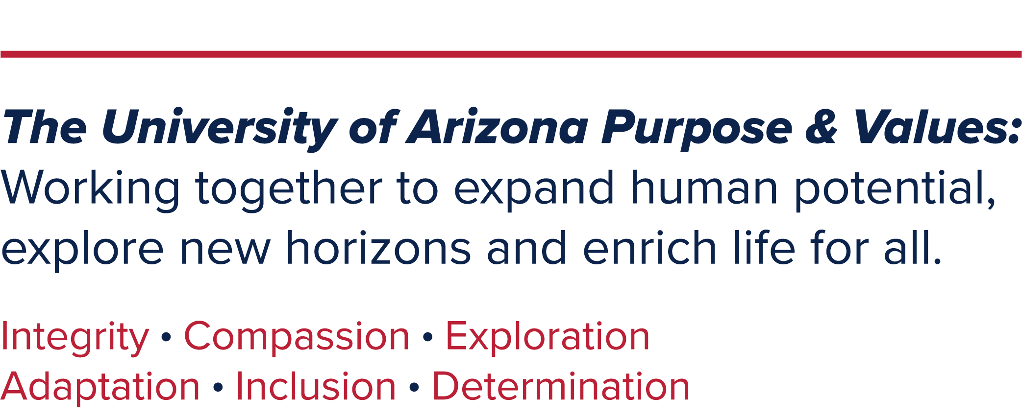 [Integrity, Compassion, Exploration, Adaptation, Inclusion, Determination]<https://www.arizona.edu/purpose-mission-values>